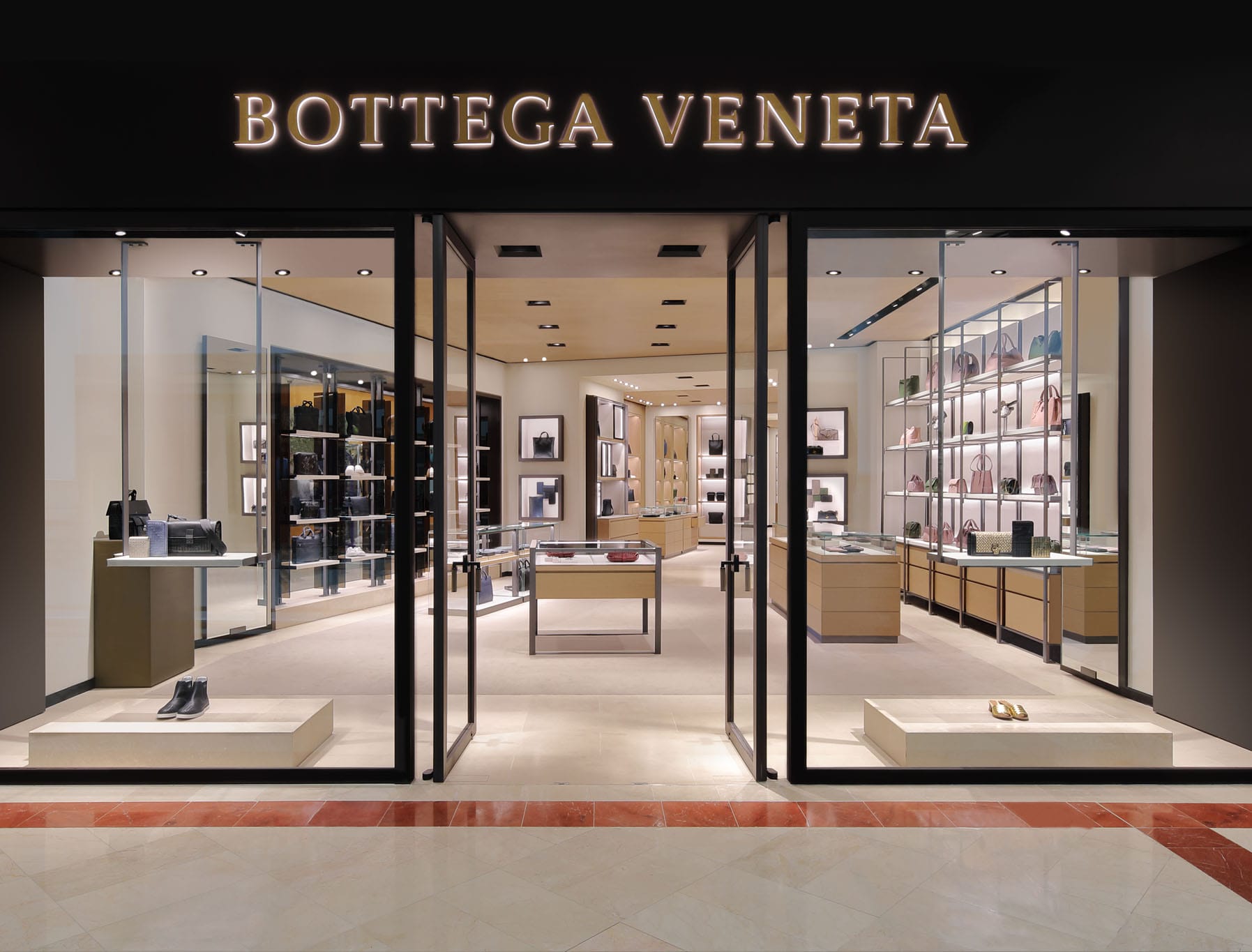 On display are handcrafted leather goods which have earned Bottega Veneta its renown, including luggage, handbags and shoes for both men and women, all with the signature intrecciato weave pattern. Other offerings include jewellery, fragrances and eyewear. An in-store customisation service allows buyers to have their initials stamped on their purchases.