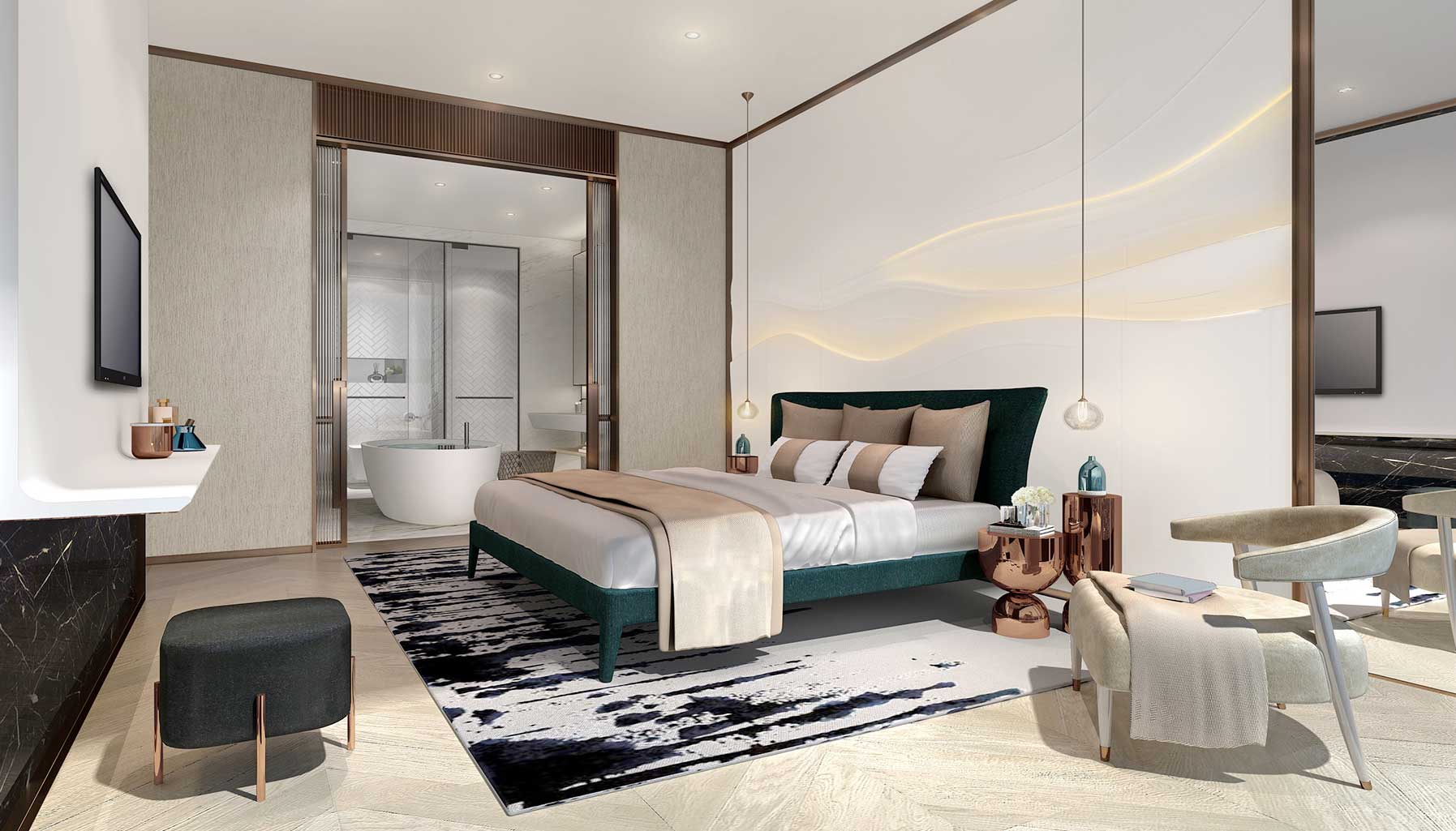 The result, for the YOO8 Tower A, is a lush living experience with the highest level of service. Leung’s design for the residences is split into two, the very Eastern concepts of Wood and Water. Wood is rich, refined and warm, with accents of gold, brass and bronze across the space, which will be fully furnished upon purchase, another nod to the luxury hotel experience. Water is light, airy and jaunty, using a colour palette of white, blue and beige to brighten and visually expand the space. Some common elements anchor both themes – a powder room at the entrance, expansive use of marble in the bathrooms, sumptuous wooden floors and beige-to-blue ombre curtains, Leung’s interpretation of Malaysian batik.
