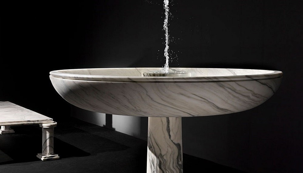 It’s smart scenography, given that marble is Lagerfeld’s material of choice. Each limited-edition piece is carved from either Arabescato Fantastico, a rare white marble with dark grey veins, or black Nero Marquina marble, prized for its subtle white “brush stroke-like” surface. The pieces were created — from first cut to polishing — by Italian craftsmen. And special attention was paid to details like the lampshades, which were painted by hand using traditional techniques, adding to the well-choreographed tension of old and new (a Lagerfeld specialty, given his creations for the historic house of Chanel).