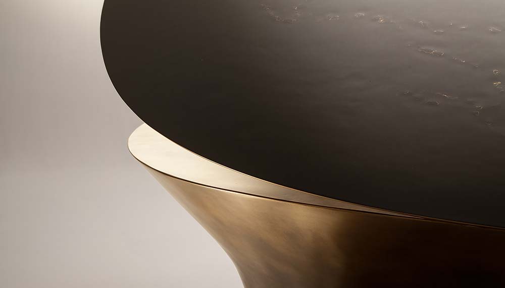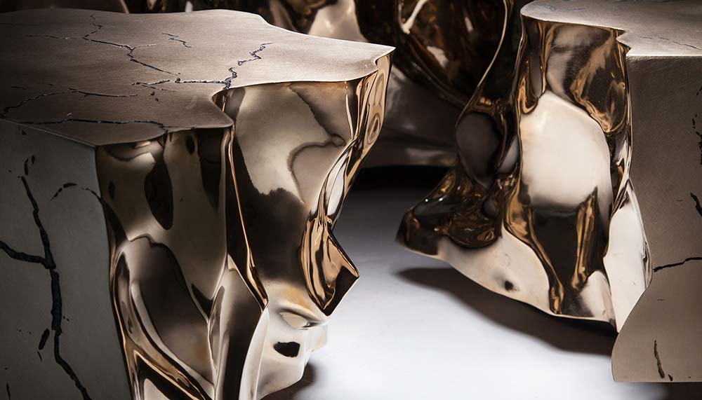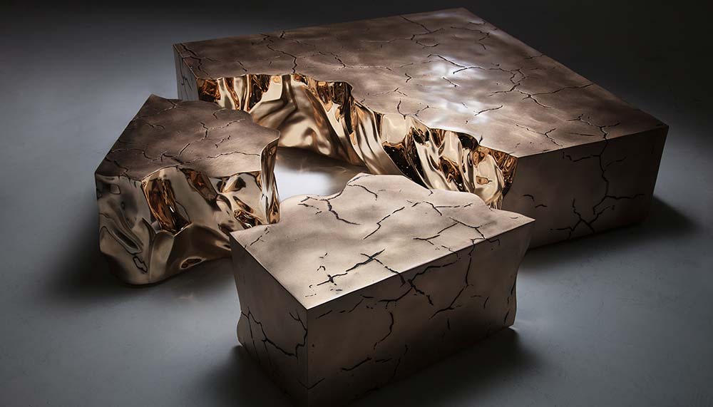 First, the drama. Ostensibly a coffee table, Fragmented Crack is more of an art installation masquerading as furniture. A square is broken up into three fissured individual pieces, each cast in bronze, representing the constant upheaval of land beneath the earth’s crusts where tectonic plates collide and combine to continuously create new landforms. The casts themselves were made from cracked clay houses at the source of the White Nile river, adding an element of rawness to the studio work that speaks of geographical turmoil and artistic representation; while still being a perfect place to place a flute of bubbly on.