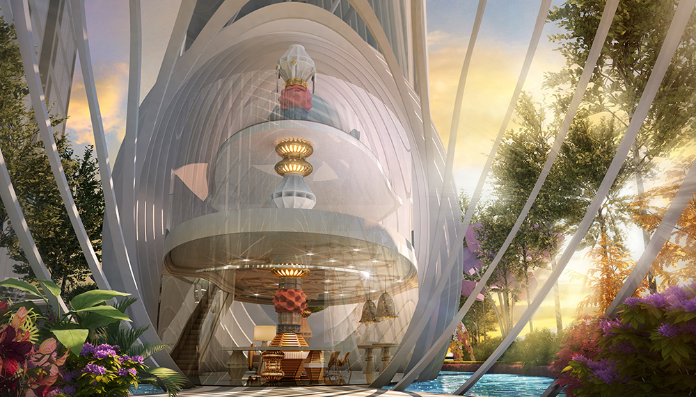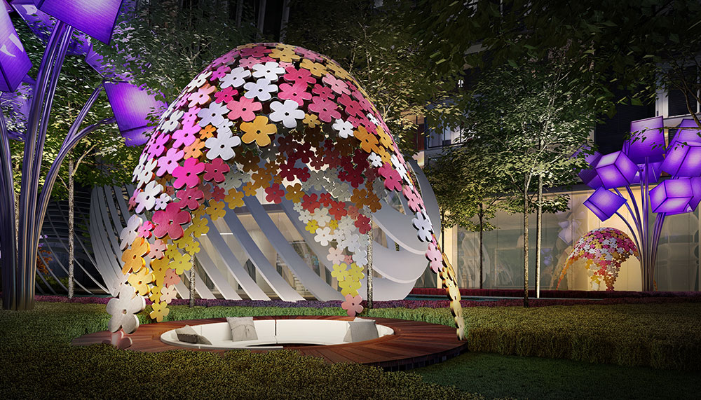 The adjacent Flower Dome – with its flower-covered gazebo – adds to the fantasy setting of Arte Mont Kiara’s landscaped grounds, as does the Tea Garden. The latter transports one to a setting of quiet trees, manicured lawns, meandering waterways and a giant lamp centrepiece. This eclectic design continues with giant decorative chess pieces by the driveway. Up above, commanding views of Mont Kiara suburbia and the city skyline, are the Jacuzzi Pods, cleverly interpreted as pools amidst a glacial landscape.
