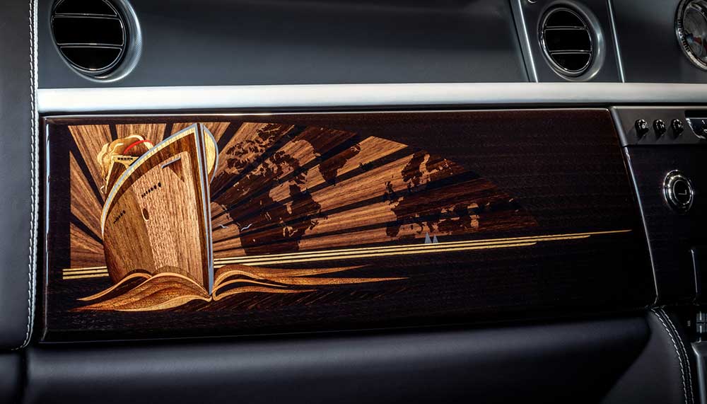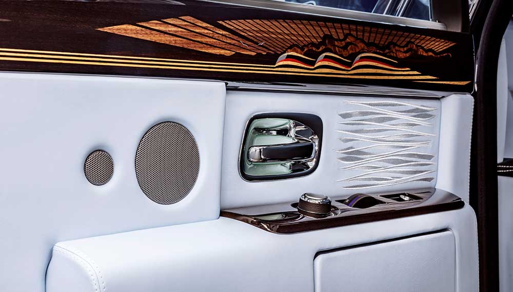 Commissioned by an unnamed Rolls-Royce collector, this final Phantom VII take its cues from the ships that criss-crossed the Atlantic between Britain and America around the time the first Phantom was introduced in 1925. With a ‘Blue Velvet’ paint scheme and careful hints of white lines in the tires, the oceanic motif is subtly evident on the outside. The deep blue recalls the vastness of the deep ocean, or the inky infinity of a midnight sky, while inside, the maritime theme is far more evident. Beautiful wood marquetry is enhanced by a stark palette, with the dashboard featuring an Art Deco-inspired cruise ship from the 1930s sailing against a map of North America and Europe immediately drawing the eye. Other nautical notes inside include: dash clocks modelled after ship radios, wavy embroidery on the Powder Blue leather and carpeting cut to look like a ship’s wake.