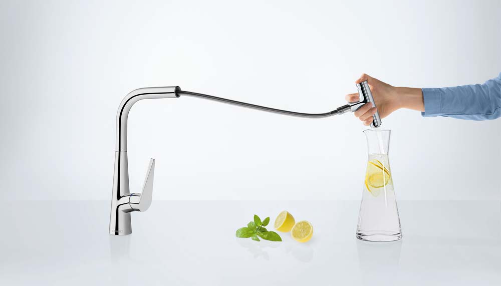 In the bathroom, the ShowerTablet Select 300 and 700 are highlighted by clear front-panel water pressure icons that protrude slightly, which is particularly convenient for children and elderly use. Built-in button controls are among the next-generation features in Hansgrohe’s stylish new Metris Select and Talis Select kitchen mixers, as well. Ideal for hassle-free use while doing dishes and watering plants, these fully mechanical fixtures have pull-out swivel spouts with a 150-degree range, and the one-touch Select button ensures water flow stoppage, eliminating drips and helping conserve water.
