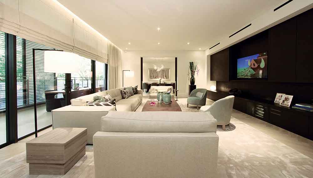 To ensure maximum privacy, each unit is accessed through private lift lobbies, with a three-car garage fitted with electric car charging, automated roller shutters and separate rooms for drivers and bodyguards. Leading security consultants were engaged to conceive passive and active systems with motion-sensor perimeter fencing as well as intercom links, from each apartment to the lobby lounge.