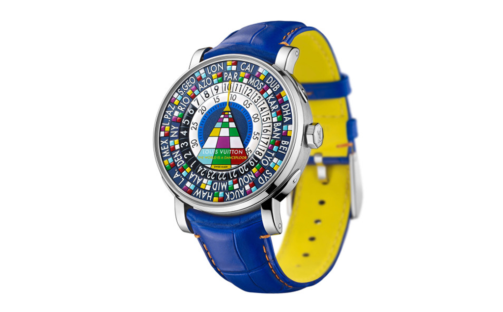 Named quite aptly The World Is A Dancefloor, the timepiece has been adapted from the colourful Louis Vuitton Escale Worldtime, and replaces monogram-inspired emblems with square, patterned tiles. The psychedelic theme is carried through from dial to strap. The tiles have been hand-painted using a miniature painting technique, while the strap features a contrasting blue alligator skin and yellow calfskin lining on the reverse.