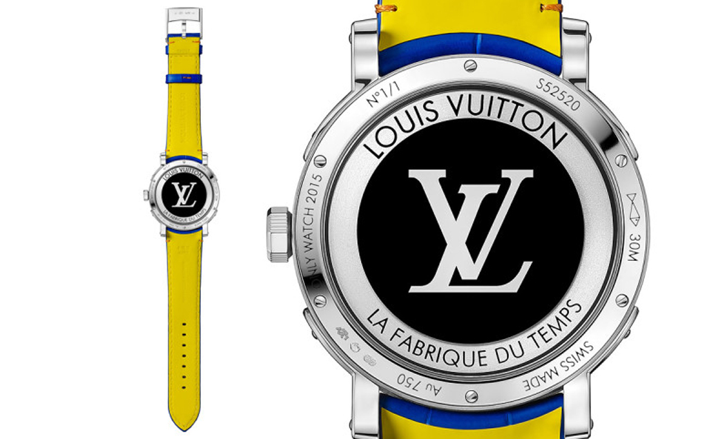The timepiece is presented in one of Louis Vuitton’s signature trunks in graphite, with the hand-painted motif adorning the cover.