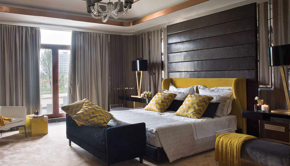 SA&V felt that the home’s topmost level – the spaces closest to the sun – should be its brightest, so the designers infused the master suite with bold lemon hues, from the velvet headboard and silk pillows to the throws and side table. They carried the colour through to the study, where a custom ebony-and-steel desk is topped in yellow leather. Even the suite’s darker pieces add a certain sheen: A settee bench at the end of the bed is swathed in sleek black velvet “that shines a little bit,” Tello says. The room opens to a generous balcony, outfitted with weather-resistant Manutti furniture, from which views of the city, if not the ocean, can be enjoyed.