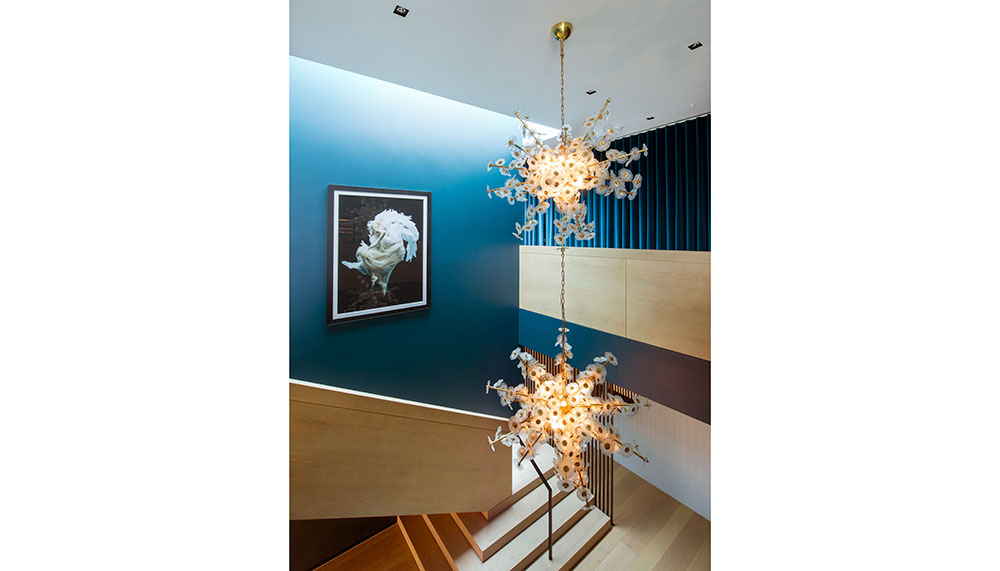 Against a palette of light oak and strong blue, cleverly selected pieces of art and bespoke furniture bring the Swinging London theme to life. Chandeliers from Alfie’s Antiques in Marylebone decorate the striking hallway, for instance, while the open-plan living and dining area features dark burgundy dining chairs from Jonathan Adler and ‘hanging hoop’ swing chairs by Lee Broom.