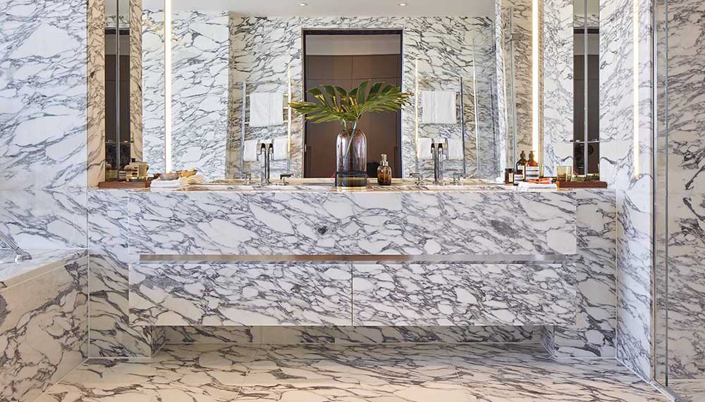Polished rosewood, blue velvet, veneered walls, daring portraits and wraparound drapes put the finishing touches on The Nova Penthouse, along with a spectacular master bathroom outfitted entirely in marble, which imparts a sophisticated spa-at-home atmosphere.