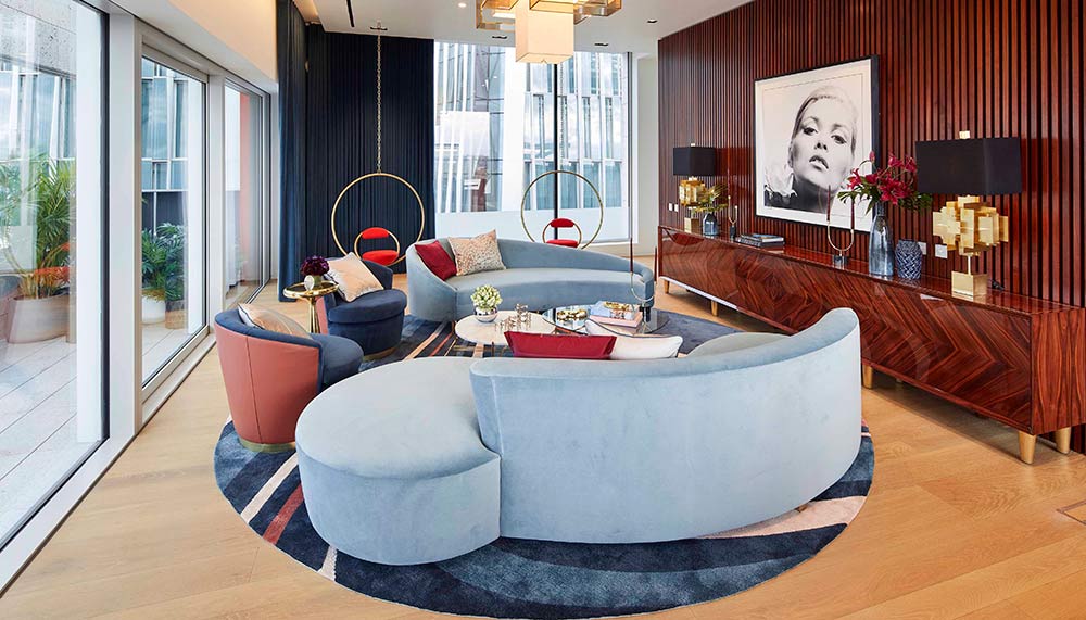 The interiors not only reflect the building’s architectural design, which references the work of European modernist architects from the 1960s and 1970s, but pays tribute to London’s artists, writers and musicians from that period who sparked a cultural revolution.