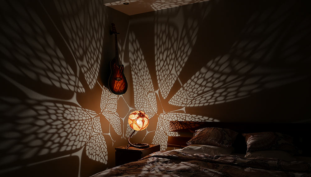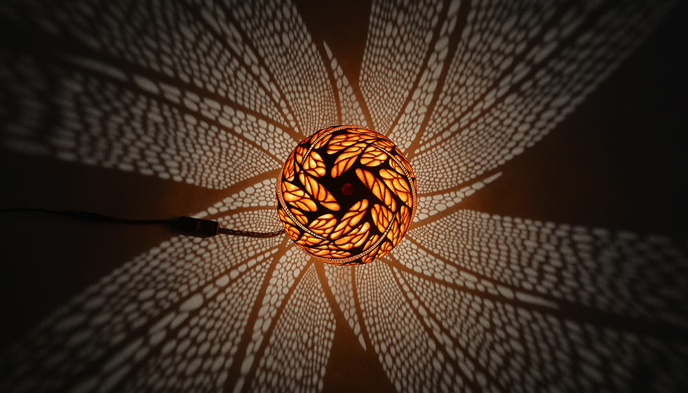 The gourd that Krawczyński makes his Calabarte lamps out of is the Senegalese calabash, commonly used in cuisine but here used as a delivery vessel to transmit beams of complicated, psychedelic patterns. Inspired by geometry, fractals and the works of M.C Escher and Haeckel, the lamps are where Krawczyński’s scientific mind meets his artistic inclinations. His first few lamps – made from Polish goose gourds – were relatively simple affairs, but bearing his trademark precise perforations that play with the light emanating from within. His first work with Senegalese calabash also marked the debut of Calabarte’s naming scheme – every lamp from here on bears a number ascribing its design, the first being Table Lamp VII Globe, a spherical illumination of the world.
