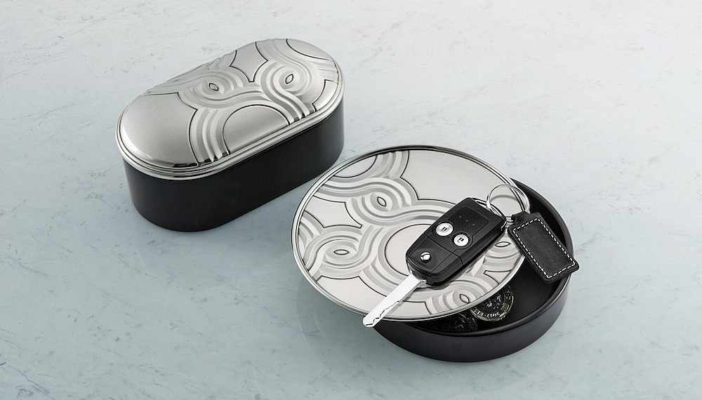 In Streamline, the glamourous glitz of the roaring Twenties is channeled into a series of home decor items. Inspired by the sweeping Art Deco movement – all chevrons, starbusts and exuberant geometric patterns – Streamline takes specific reference from a rug designed by textile designer extraordinaire Marion Dorn (1899-1964). Dorn came to England from San Francisco in the early 1920s and by the mid-1930s, was considered a leading extile designer. She carried out commissions for London hotels like Claridge’s and the Savoy, and for the ocean liners Orion and the Queen Mary. The focus on her fluid concentric curves here are typical of the bold luxury of Art Deco, and specifically its nautical use, translating beautifully onto pewter. The collection consists of a valet tray, serving tray, trinket box, pendant, candlestand, hip flask and bottle chiller.