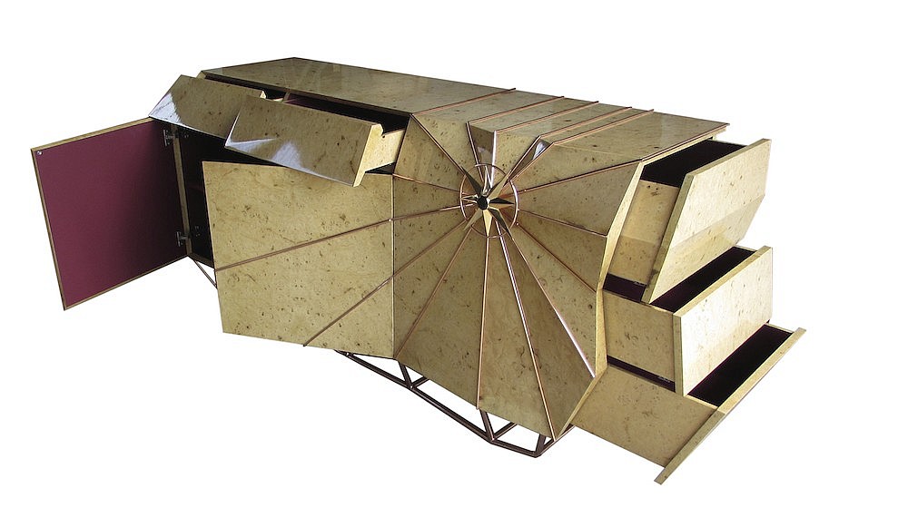 With a fine lacquered wood interior and velvet-lined drawers, this sideboard will be perfectly placed in a dining room, a conference room where crucial decisions are made, or indeed, a private yacht.