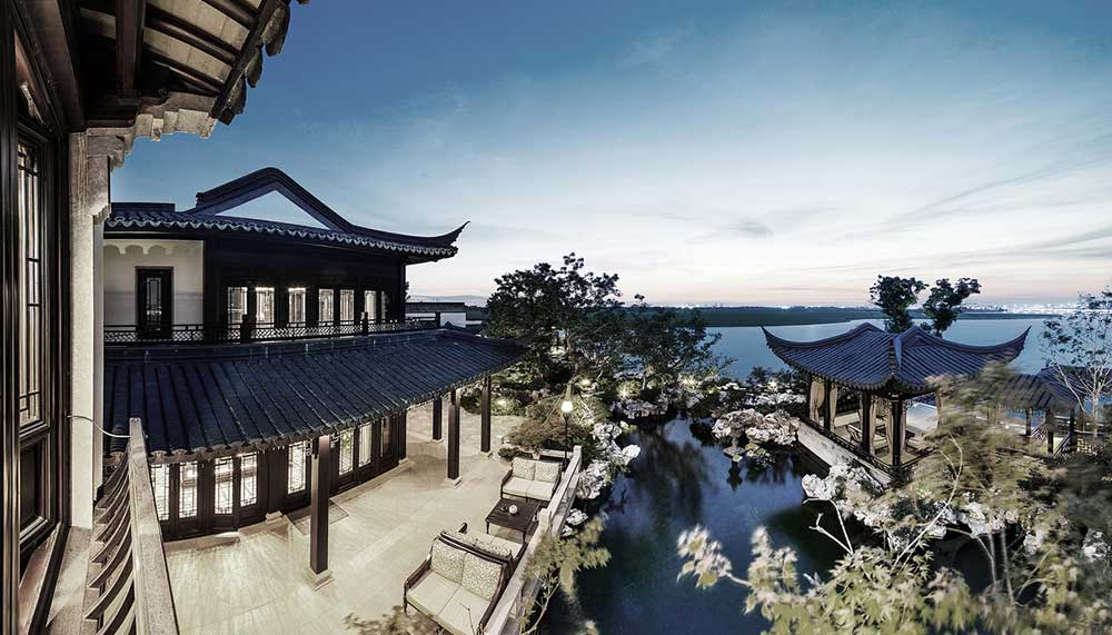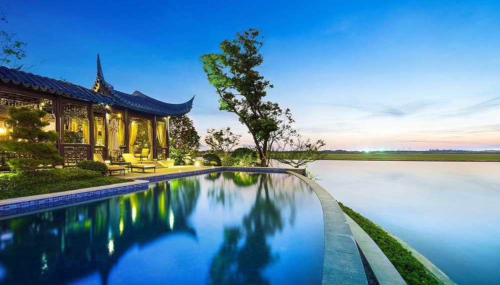 Situated on a private island at the heart of Suzhou’s Dushu Lake (China’s largest), the posh compound is considered highly desirable because its location and shape are in line with the laws of feng shui. Inspired by the city of Suzhou – a maze of waterway canals, leafy gardens, and zigzag bridges – the classic Chinese estate took three years to complete and features 32 bedrooms and 32 bathrooms. Outdoor pavilions overlook the lush grounds that were modeled after the Classical Gardens of Suzhou, a UNESCO World Heritage Site, and are teeming with native plants, craggy rocks, reflection pools, and a bubbling waterfall.