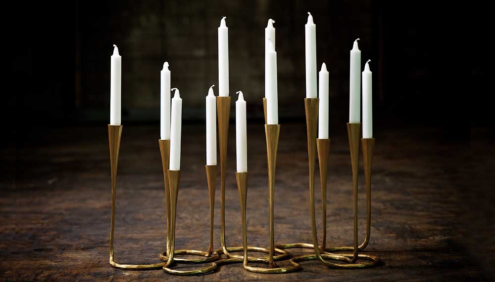 The THALIA collection is slightly more geometric and sculptural, though subtle elemental touches still surface. The Daisy Candle Stand, for example, looks like a magnified section of coral, with graceful bronze trombones holding shining candles. How about the Ranchu bowls, mesmerizingly seedlike? Or the Water Drop Bowls, looking like golden cracked eggshells.