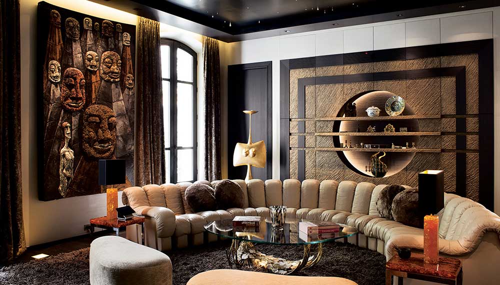 The table in the formal dining room is heroically scaled: An 18-foot-long sweep of glass sits atop a 1970s abstract metal sculpture by an unknown artist. Plexiglass chairs by Laverne defer to this impressive construction. Two triangle tables in stainless steel by Philippe Hiquily sit beneath a Pierre Sabatier acid-etched copper wall relief that is embossed like a traditional African mask. The space sits in contrast to the breakfast room, which is adjacent to the kitchen and ideal for more casual meals. It features an Ado Chale metal table whose top is rippled to suggest a stone thrown into a pond.