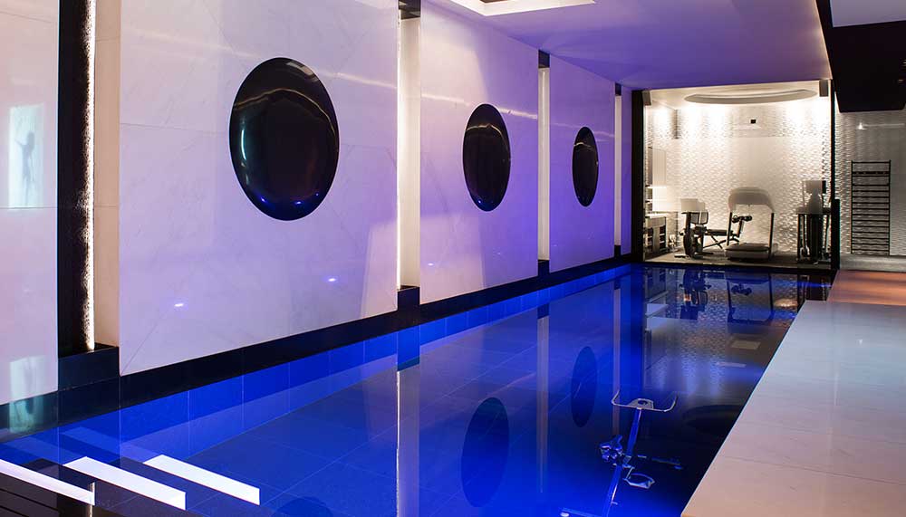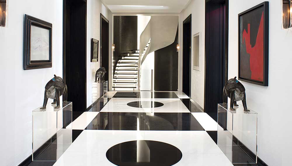 The personality expressed between the walls of this five-bedroom property is an intriguing mix of austerity and artistic indulgence that reflects the complementary tastes of the homeowner and Gastou. Gallizia stripped the 19th-century property of its interior mouldings and redecorated it in a monochromatic palette with concealed LED lighting. The foyer sets the tone for the home with its marble inlays – black and white squares and circles that subtly reference the geometries of classicism, art deco, and op art. There is a more direct reference to history in the 16th-century lion sculptures, which are mounted on plexiglass stands beneath modern paintings.