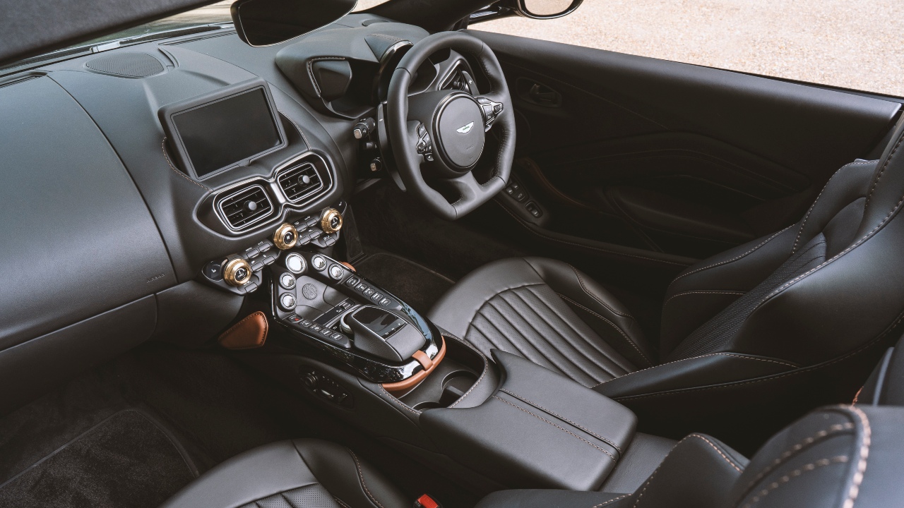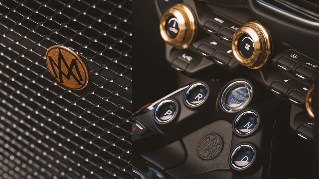 The result of this project is the Vantage Roadster as it has never been seen before. It has an aluminium-bordered black mesh front grille that recalls that of the original A3 chassis. On this sits a small brass-coloured badge depicting the original Aston Martin logo. The side fender panels are a contrasting aluminium tone, engraved with ‘NO_3’ and are fitted with a decorative leather strap that references the bare metal bonnet with pull-straps of the A3. Visible behind glossy black wheels are bronze brake callipers. Inside, the Vantage’s sporty-elegant interior is enhanced with retro details such as brass rotary switches and an embossed, period-accurate logo on the centre console.