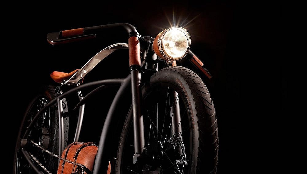 The bike’s elongated steel frame echoes the proportions of a motorcycle, with a gently curved steel bar that extends from the handle bar post to the seat and follows the same line as that of a motorcycle’s gas tank. The saddle, motor casing, headlamp casing, handgrips and other components are made from jatoba wood (a species that grows in Central and South America), which the company says is as strong as steel. And while this claim seems a little dubious, the visual effect of the richly coloured, deeply grained wood is unquestionably arresting.