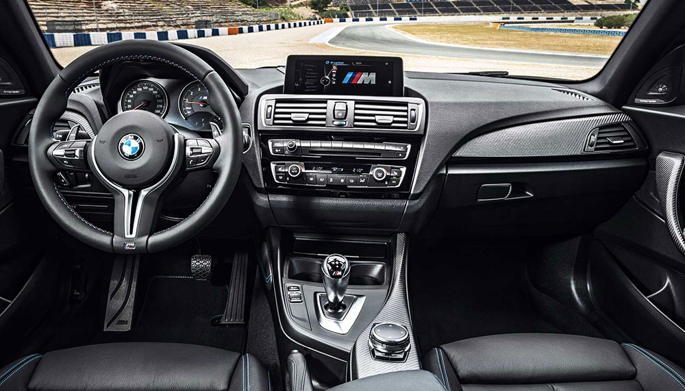 The time-honoured character of BMW M cars is also present and correct in the design of the interior. The Alcantara of the door cards and centre console together with porous carbon fibre creates an ambience of rare quality and heady sporting ambition further underlined by blue contrast stitching and M embossing on selected details. Sports seats, an M sports steering wheel and an M gearshift lever ensure BMW M2 drivers are in perfect command of their car it at all times.