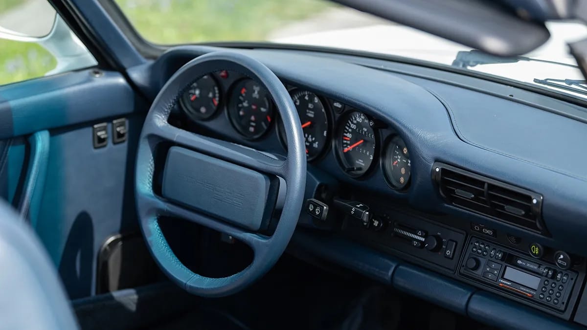It wouldn’t take Feustel long to accomplish his goal, and the one-of-a-kind 959 “Speedster” would be displayed at the 1989 editions of the Frankfurt International Motor Show and the Essen Motor Show. The modified convertible is finished in Grand Prix White and features a blue leather interior and matching electronically operated soft-top. The car, which looks like a factory creation, comes with a removable white hard top, a blue tonneau top, spare “Speedster” windscreen, and extra side-view mirrors. Having been driven only sparingly over the last three decades—the odometer shows around 5,150 miles—it remains in excellent shape and was serviced just last month.