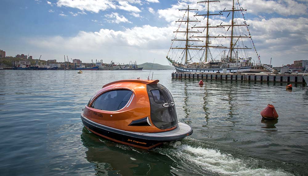 A watercraft with character, the Jet Capsule appears more like a pelagic pod plopped down from its intergalactic mothership than a boat built in Italy. Designed by Pierpaolo Lazzarini, the high-tech transport is fashioned mostly from carbon, features a V-shaped hull, and can carry single or double engine options (paired with hydro-jet propulsion) totalling up to 520 hp for a maximum speed of 50 knots.
