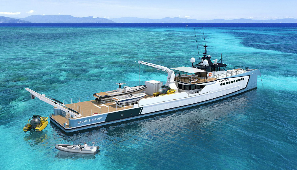 Released in June this year, Damen’s new Power Play is more than just a support vessel that carries tenders, toys and extra provisions. The 182-footer (about 55 metres) is actually more of a hybrid between a shadow boat and primary yacht, with three large staterooms, a main-deck saloon, and a rear deck for guests.