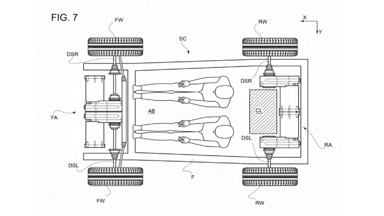Included in the application is a series of illustrations that show off the technology, and one appears to offer a peek into what the vehicle might look like. The illustration depicts a two-passenger car with an electric motor connected to each wheel, meaning the EV would be all-wheel-drive. The application mentions that the set up would also work with an internal-combustion engine, so, in theory, the tech could be used for a hybrid sports car.
