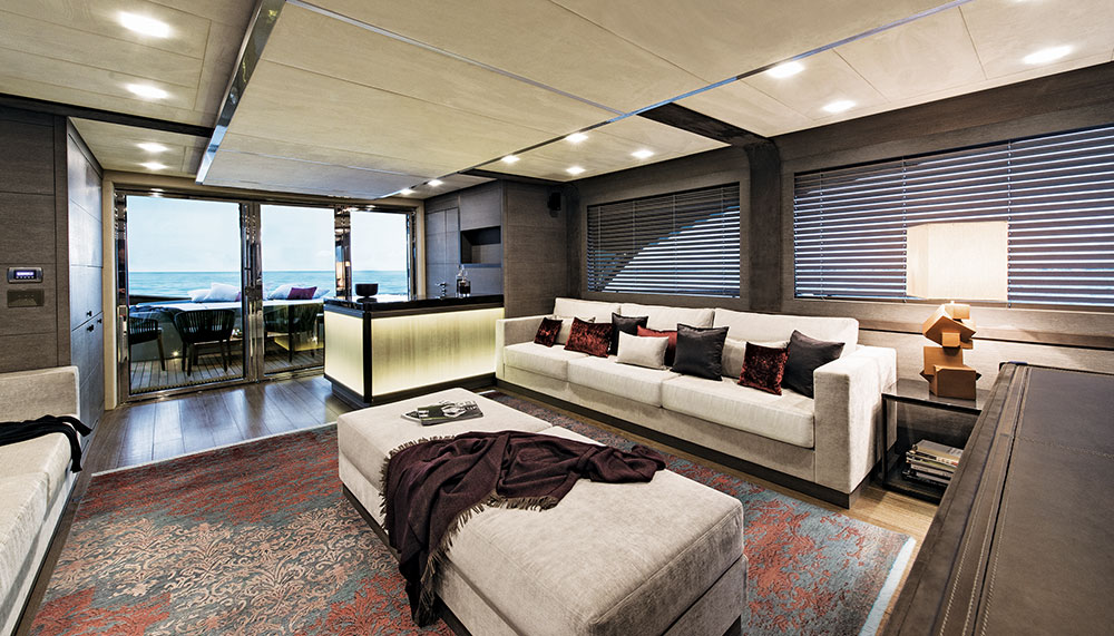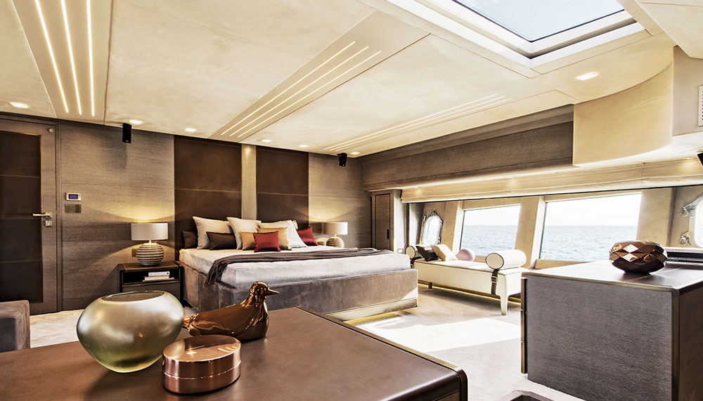 The 105’s most impressive living area is the full-beam, split-level, 485-square-foot master suite. On hull number 1 in the series, the suite is decorated with brushed grey-oak panelling, Poltrona Frau lounges, and Hermès and Armani fabrics. Three steps down from the bedroom are two bathrooms that feature Brazilian Magic Brown Stone floors and Carrara-marble inserts.