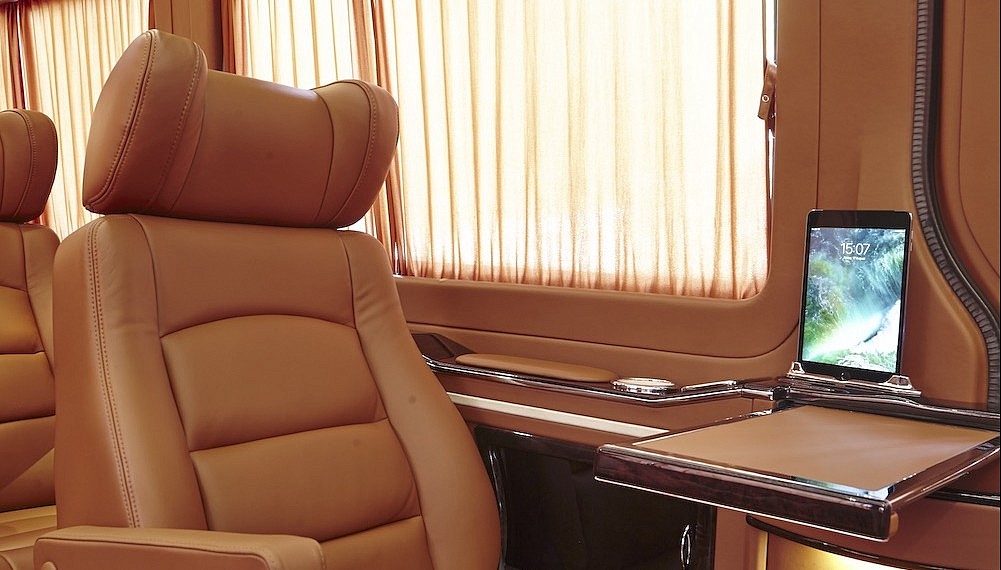 The range of upgrades include a built-in refrigerator, 42-inch screen, on-board Nespresso machine, Wi-Fi and individual USB points. Its palatial interior is a lush mix of wooden flooring with an alcantara-covered roof embedded with ambient lighting. This configuration replaces existing base trims and panels with soft-touch materials and wood veneers.