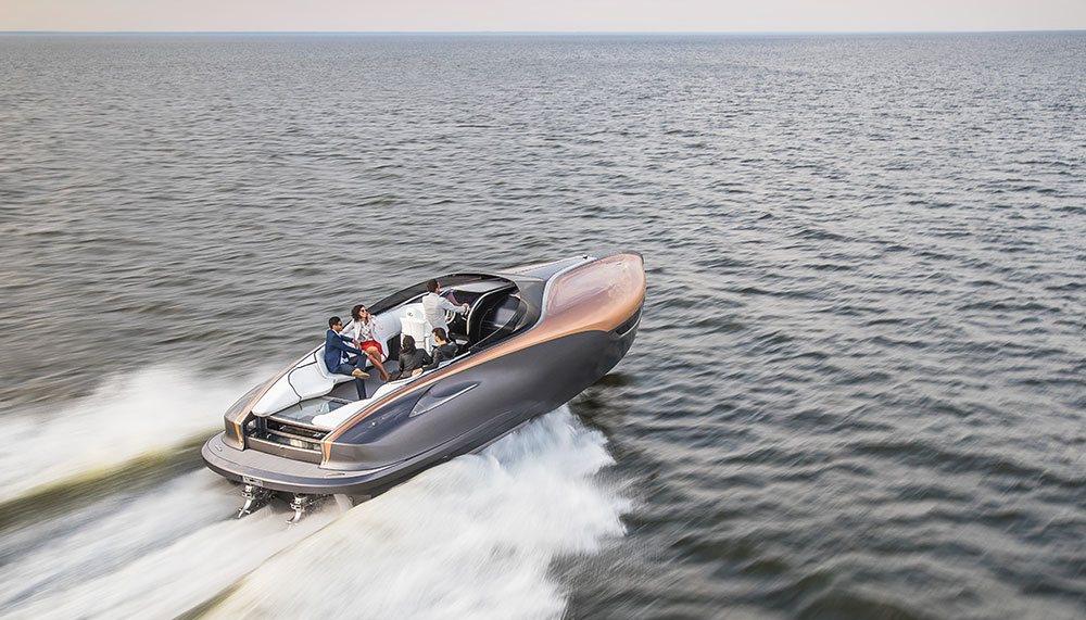 Penned at the Lexus Design Centre in Japan, the brief outlined an open sport yacht for recreational day leisure for six to eight guests with the aesthetic character of the luxury marque. Construction heavy in carbon-fibre reinforced plastic — similar to world-class racing sailboats — keeps weight down and strength up for the 42-footer.
