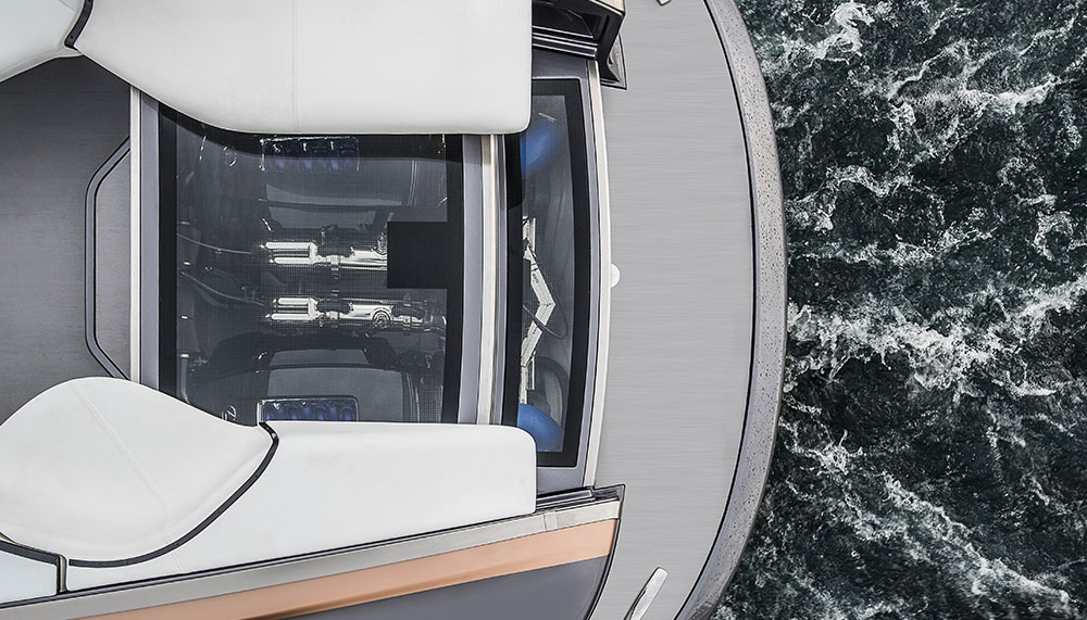 At the helm, a colour touchscreen panel is the interface for onboard systems and controls with a captain’s chair featuring armrests which double as fold-out jump seats. Entertainment tech includes fully networked AV entertainment with 4G, WiFi and WAN connectivity experienced through Mark Levinson and Revolution Acoustics hardware using the ceiling panel as a transducer.
