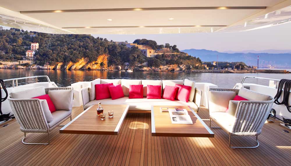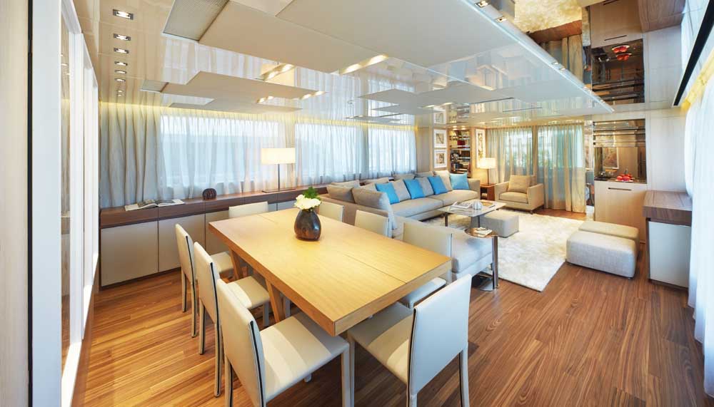 A signature feature – now widely copied by other shipyards – are the expandable balconies on either side of the yacht. An opulent salon offers the fullness of space for parties and lounging on the main deck. Rubber mountings and extra-thick doors ensure silent running while aluminium frames for the cabin housing also consolidate the high levels of sound insulation and anti-vibration.
