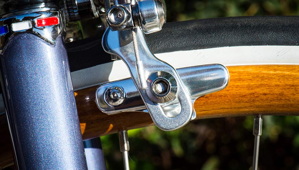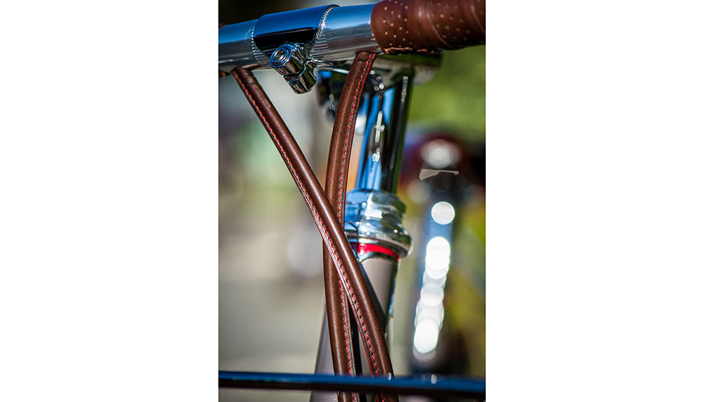 The leather is prepared by an atelier in the city’s Belleville area, which then stitches the seat covering and wraps the handlebars. The beechwood wheel rims and mudguards are sourced and shaped in Italy near Lake Como; the chrome work, polishing and enamelling are handled by different French companies. Then, as the piece is almost complete, the final patina is done by Tamboite and the bike is numbered.