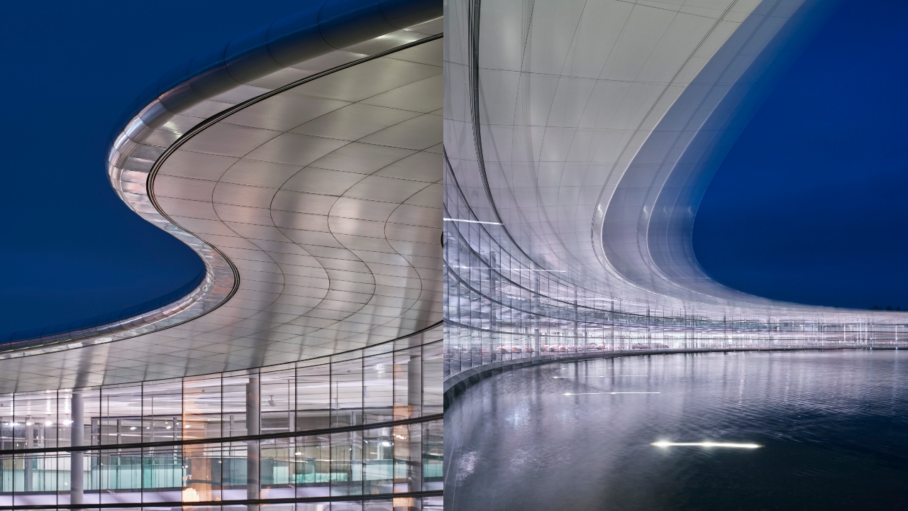 For an automotive brand made famous by a clinical design approach, there is a theatrical touch to McLaren’s headquarters complex. VIP visitors are directed to a specific entrance at the end of a gracefully winding road. The scene on the left is that of the rolling landscape of the outskirts of Woking, a town in England not far to the southwest of London. The scene on the right is a dramatic panorama of the McLaren Technology Centre.
