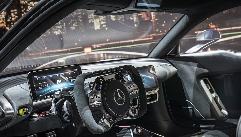 Inside, one finds not so much a steering wheel as a motorsport-style rectangular helm. The spartan cockpit’s only distractions are twin 10-inch displays — one seeing duty as an instrument cluster while the other is mounted centrally for use as the COMAND infotainment interface.