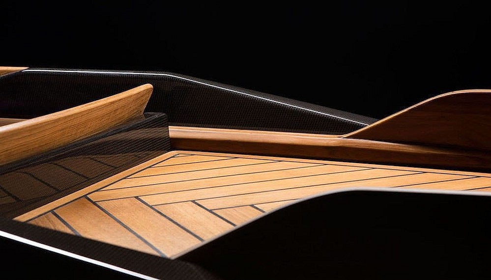 With a hull made from copper-woven carbon fibre, the Monocoque Palle is lighter than it looks. And it looks stunning. The copper wire woven into the carbon fibre not only gives the dark outer surfaces texture, but also flicker in the sunlight. The teak surface, laid in a herringbone-like pattern, was handlaid by Maestri d’Ascia, a renowned artisanal boat craftshouse in Genoa. So streamlined is this design that the oars can be tucked into the side, allowing for easy storage and even easier transportation. And if you’re more a fan of motorised transport, word is the BorromeodeSilva is working on a version with a integrated small electric motor.