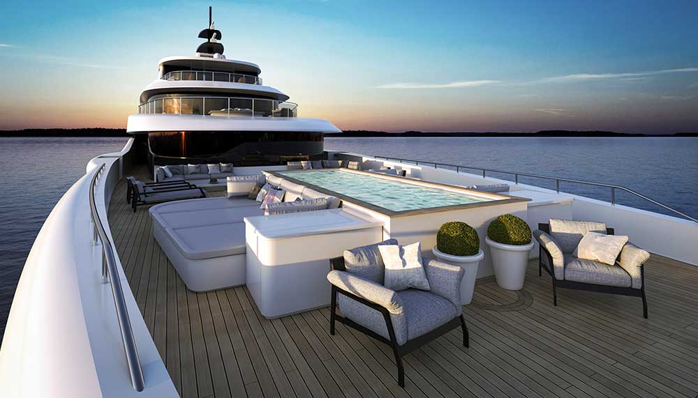 Owners can still express their individuality, however, with the ability to customise the configuration of living spaces and tailor interior aesthetics to taste. And depending on the size selected from the fleet, the creative canvas can include up to seven guest cabins, two saloons (connected by staircase), an upper deck with a pool and extensive lounge area, a dedicated owner’s deck, and a sundeck with bar.