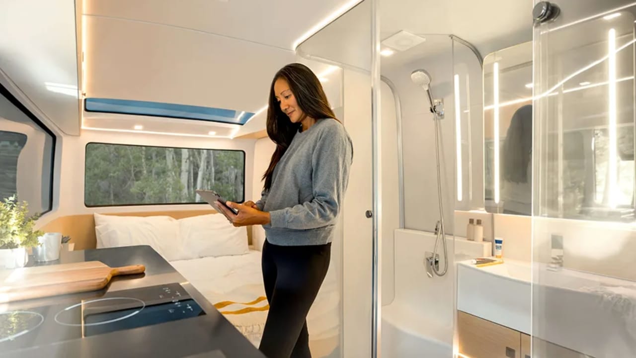 Those aren’t the only aspects of the camping experience that the smart trailer makes easier, though. One of its more intriguing features is the “Instacamp” system, which automatically levels the caravan out, deploys its entry staircase, opens up the awning and turns on the lights once you’ve parked. The system, which is controlled via the app, can be used in reverse when you’re ready to break camp. The Flow also comes equipped with a 45 kWh LFP battery pack and roof-mounted 1,000-watt solar panel spread that can keep everything running for up to a week off-grid. Don’t worry if it’s cloudy, either. The Flow’s power system also allows it to be used as an emergency power source.