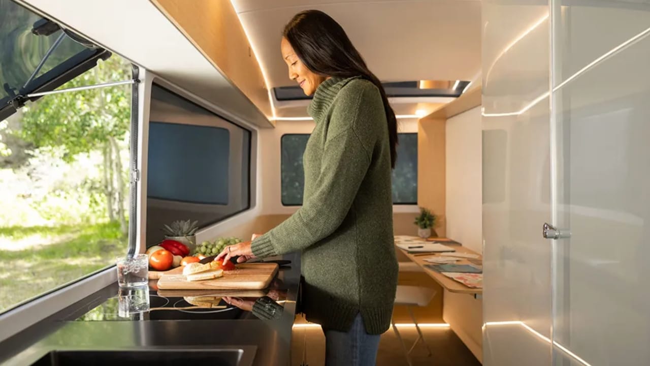 Outside all its smart tech, the 25-foot-long Flow is also one of the more unique-looking trailers available. The caravan has a minimalist design with giant wrap-around windows that provide a 270-degree view of the surrounding landscape. The streamlined look carries over to the versatile interior. There you’ll find a kitchen with a two-burner induction stove, a smart-glass encased bathroom, and a multi-purpose space with a Murphy bed that can be folded up for access to a mobile workstation or dinette. There’s also a flip-up service window next to the kitchen block that allows for indoor and outdoor cooking.