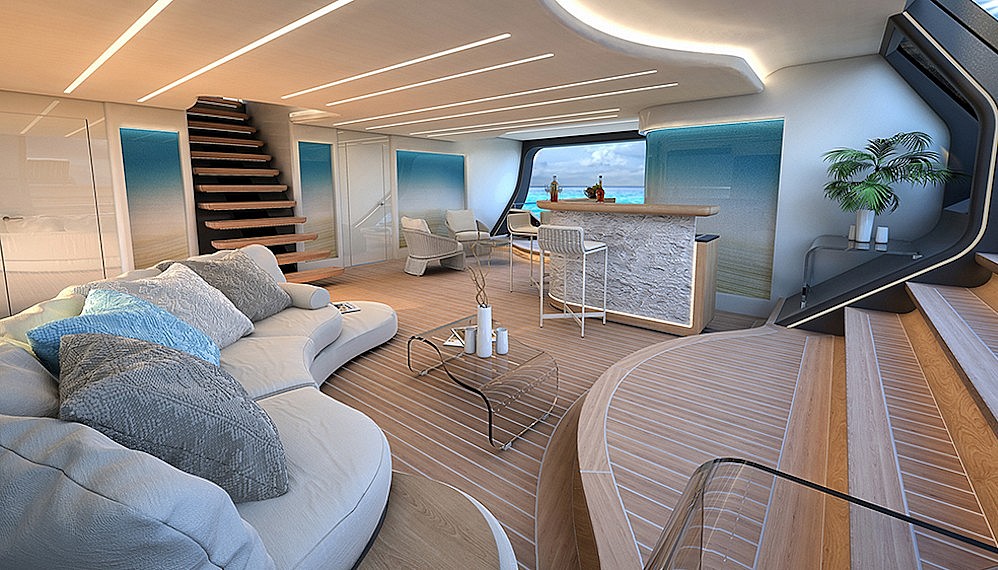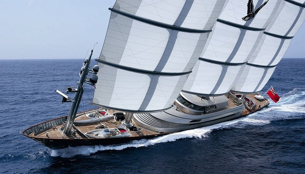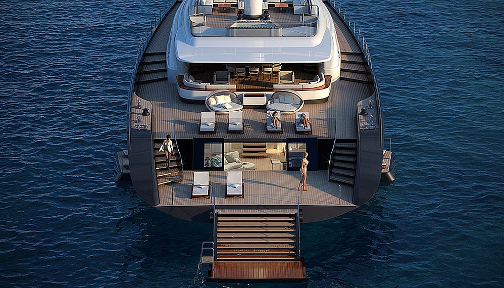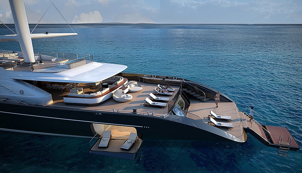 In the case of the 72-metre (236-foot) version, the platform is much wider, which means it keels over less, has more volume, and allows for more spacious owner accommodation. The wider hull and transom provide a layout more commonly seen on large motor yachts, with a beach platform, open side hull and an inside-outside theme. The increase in power means more velocity, so the Falcon Rigs can be pushed to their limits, while the design itself means guests can walk around and enjoy the boat in safety.