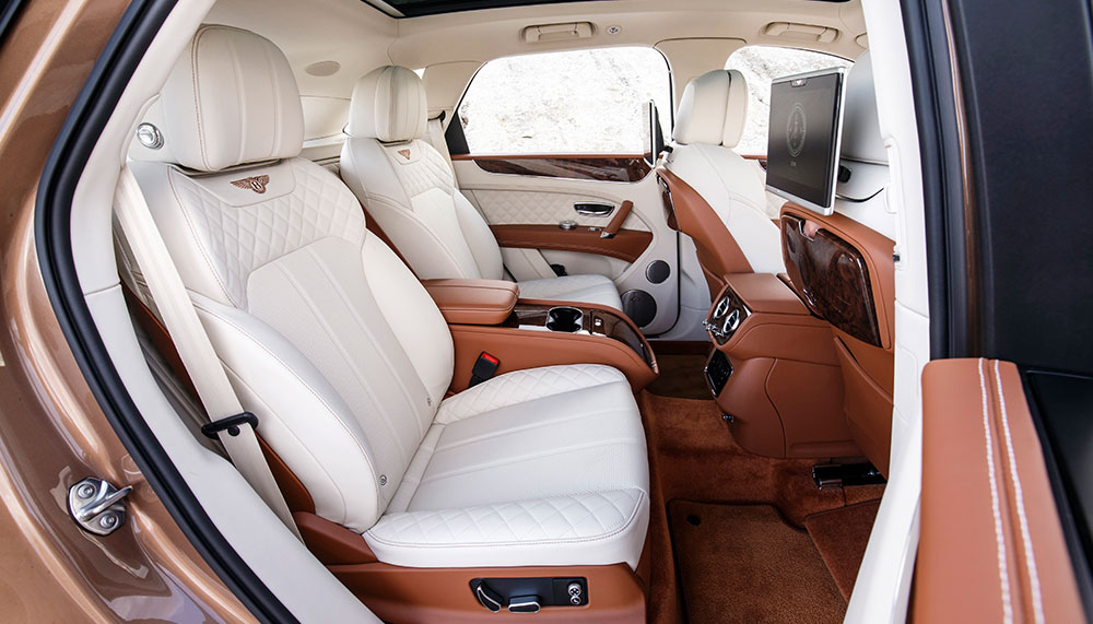 Inside, Bentley’s famed craftsmanship comes to the fore, with tenths of a millimetre tolerances applied to interior trims and the requisite luxe combo of leather, wood and chrome. Bentley’s 58 dedicated craftspeople at its woodshop for the Bentayga’s veneers alone offers the customisation options which may even be matched to a personalised three-piece picnic hamper set, trimmed in diamond-quilted leather containing Linley china and crystal. High horology enthusiasts may also choose to kit the dashboard with a solid gold mechanical tourbillon by Breitling of diamond indexes – which comes with the added advantage of periodic winding from a dedicated drive within the car.
