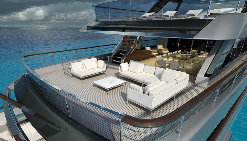 The skydeck, the uppermost of the four decks, will likely be a favorite spot for guests, thanks to the requisite hot tub, bar and lounging areas. The shade-supplying radar arch is in bold black, with stylised stainless-steel details easily seen from afar – a unique sight. “Get a look at the exterior navigation lights,” urges the fine-art-loving Galassi over lunch. “They are [like] a sculpture.”