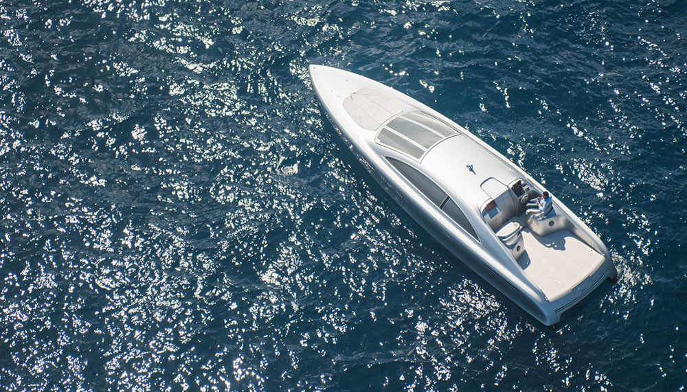 Its nickname isn’t accidental; referring to collaborator Silver Arrows Marine, it also describes the optics of the boat – a mercurial streak across a deep blue sea that is inspired by the Mercedes-Benz F015 and Concept IAA vehicles. Holding up to 10 passengers, the interior is a plush playground of nubuck leather and eucalyptus wood, with retractable side windows and a raised windscreen that allow a panoramic repose. The configuration of each yacht will be unique to each eventual owner, with options including a bathroom unit, air-conditioning, an audio system, a wine cellar and an ice-maker.