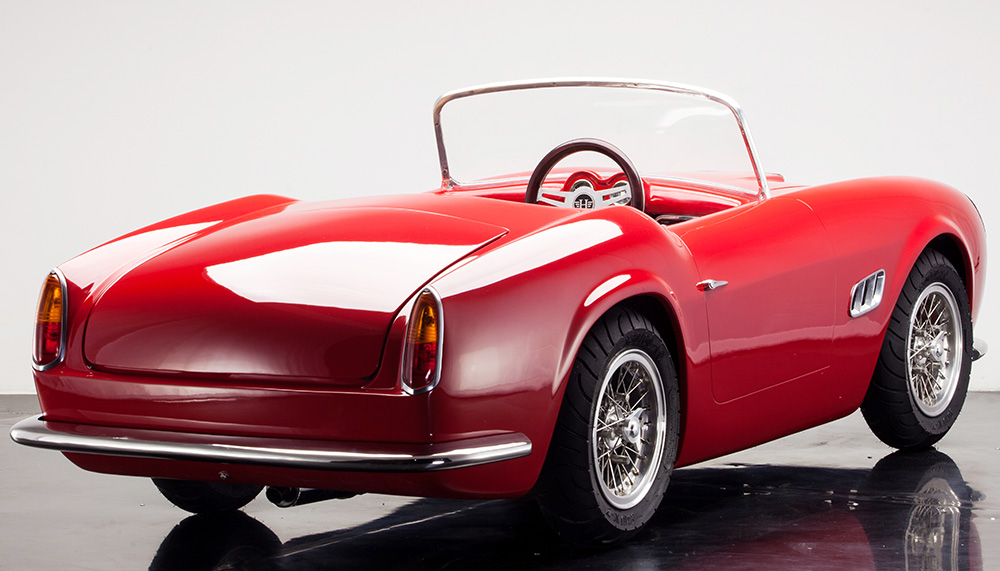 The design of each Junior Car was inspired by an iconic classic car, harkening back to the glory days of the racing-inspired automobiles of the 50s, 60s and 70s – a vintage Formula 1 racecar here and a swinging icon there. Each car is equipped with an independent wishbone suspension up front and in back, adjustable gas shock absorbers on all four heels, vented disk brakes with Brembo calipers front and rear, and a working horn, lights and turn indicators. The front-mounted, air-cooled, 125cc four-stroke engine sends powers to the rear wheels through a 3-speed semiautomatic transmission.