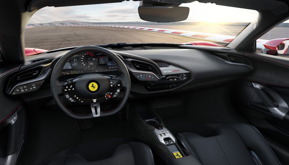 Stradale features an all-wheel-drive configuration. One motor-generator sits at the back of the engine, feeding instant electric torque into the latest evolution of the company’s dual-clutch 8-speed gearbox. The other two are mounted up front to constantly and individually adjust power delivered to each front wheel, sharpening steering response when entering corners, maximising traction and propelling the car out of corners with speeds no other Ferrari can equal. Each motor is likely producing a touch more than 100 ft lbs of torque – available at zero rpm – combined with another 590 ft lbs from the V-8 that peaks way up at 6,000 rpm. And thanks to a tiny flywheel, the V-8 revs like mad. The exhaust system is engineered not only to promote deep breathing but also to serve like a musical wind instrument. No matter the turbos and electric motor, Stradale’s voice soars.