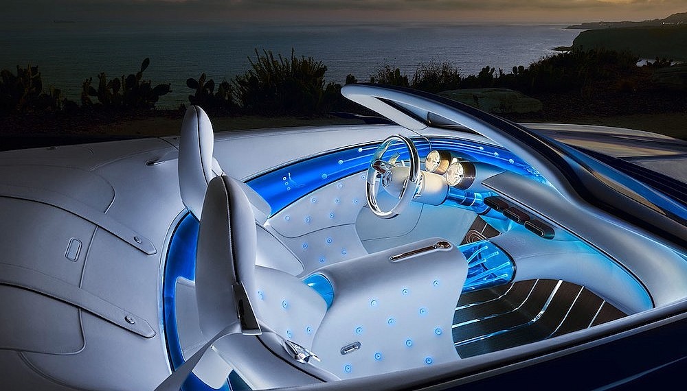 Based on a coupé concept that debuted at Pebble Beach last year, this open-air one-off uses a removable fabric top composed of interwoven rose-gold threads, providing cover for inclement weather. The exterior is dominated by minimalist lines and simple curves. The front end echoes the grilles of current-model-year Mercedes-Maybachs, while the rear is a boat-tail design reminiscent of vehicles like the 1929 Mercedes-Benz S Barker Tourer.