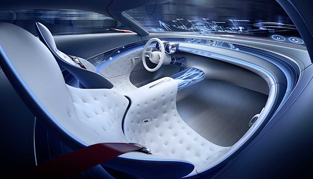 Within the gullwing doors is a cocoon of luxury, the dashboard display encircles occupants while the windscreen features full-width augmented reality – useful when switching to autonomous driving mode. Miniature body sensor displays feature in the leather upholstery, monitoring passengers’ vital functions while on the move.