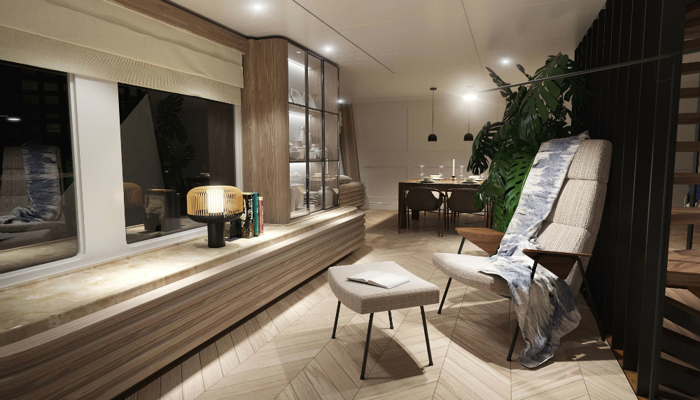 Features like a lounge hanging from a ceiling rope in the dining room (with its rough-hewn table and simple chairs), fabric-laden recliner near a side window, and simple-but-elegant saloon decor make this Vripack design one of the most relaxing interiors on the water. The company has yet to release images of the exterior, but presumably it will be very much in sync with the rustic beach-house interior.