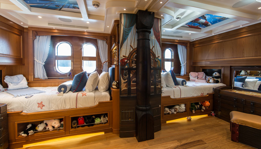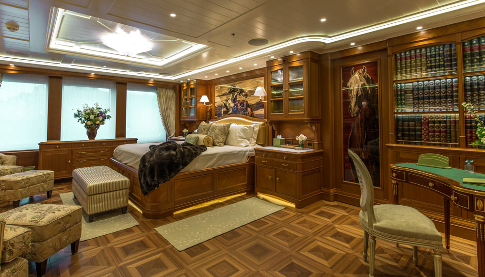 Indeed, the yacht is a celebration of craft and art on a larger scale. The cabins, for example, are similarly festooned with marquetry, with each also having its own nature scene and an abundance of murals.